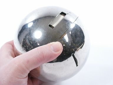A piece that most have only heard about or seen in the Doctor Q book by Alexander copyright 1921. This heavy nickeled ball contains gears driving a drum that paper has been attached to with the information collected from audience members giving the impression that genuine thought reading is occurring. The action of this inner drum is controlled by an exposed cog operated by the thumb of hand holding the ball. Some minor depressions otherwise ball in very good and functioning condition. Ball weighs little over 1 1/2 pounds. A rarity. | |