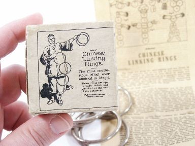 This scarce set of 8 rings includes the original box with graphics and instructions. The rings have light surface rust otherwise condition good. Box in very good condition. | |