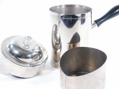 Doctor Burgun a highly skilled dentist whose hobby was magic and manufacturing beautiful first rate apparatus for performing magicians. It is unlike other types of Welsh Rabbit Pans in construction and made of stainless steel with several parts. It is actually a wonderful routine of comedy as the magician borrows a hat and places the pan in the hat with the pretense of pushing out the bottom of the hat. Following this action the magician takes and cracks eggs into the hat tossing in baking flour followed by a good squirt of lighter fluid and the expected match. Flames are seen above the brim of the hat and the magician realizes that the pan is what he should have been using and not the hat so he grabs the pan to stamp out the flames in the hat! After all this action the magician lifts the lid away from the pan and repeats the eggs and flour which is set on fire or not stating that the pan was still hot enough from putting out the fire in the borrowed hat. The lid is placed on and a magical gesture then the lid is removed and Happy Birthday here comes the cake from within the pan! The hat is lifted and shown to be without harm and returned to the poor spectator that was starting to talk badly about magicians. One inch surface area with tiny dimples in the body of the pan just under the bottom lip of the cover lid. Many thanks go to Ken Klosterman for assistance on some of the historical background of this wonderful piece. Residing in his Collection is one of the three known to exist. Circa 1940. | |