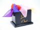 Also known as the Japanese Handkerchief Box this made of wood and a nice size to handle measuring 6 inches wide x 4 inches deep x 5 inches high along with a wood platform base. A box with a removable bottom platform and no top is shown empty yet the magician is able to produce the included 5 silks. Silks are in new condition. If this type effect was good enough for the Great David Devant to devise a routine for its use then I should think it would be worthy of consideration. Includes illustrated basic instructions for handling and in very fine condition. | |