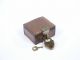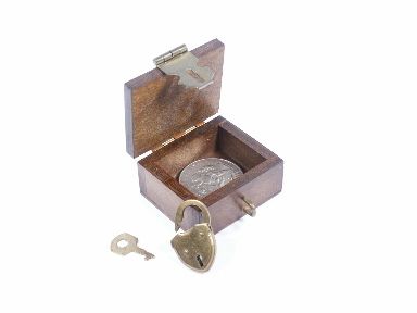 A more shallow version than usual measuring 1 15/16 inches wide x 1 11/16 inches deep x 1 inch high with a seamless fit of the secret pivoting door. No coins supplied. Includes 2 pages of instructions which include Don Alan's routine using a signed dollar bill that vanishes from under a handkerchief and in its place is a folded piece of paper that has the key to the lock on the box stapled in the middle and when the key is removed and used to open the padlock it is found that the signed bill is found within! Condition very fine. | |