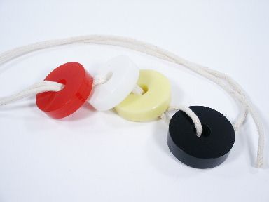 This is the Arturo and UF Grant Amazing Checker from Rope Release with 2 7/8 inch checkers beautifully made of different colors of plex. The magician demonstrates that once a checker is placed on the rope and then three more over both ends that it would be impossible to pull the other checkers past the first one and off the rope. The rope is placed over a spectators head with the checkers hanging at the middle of their back. One at a time the magician removes the checkers by magic with all being examined at end! Includes illustrated instructions. Condition beautiful. | |