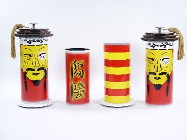 If your desire is an effect that will mystify and is showy and large enough that a sizable audience may see and enjoy then this will be for you. This has been meticulously kept in a special made container for travel to keep it in nice condition. This may be performed on one night club size table or full stage using three tables. Rice is poured into a canister. An orange is placed under one of the large decorated covers and a stack of loose checkers is covered with the other large decorated cover. An amazing transposition occurs as the magician turns over the canister filled with rice and out rolls the orange! The large decorated cover that was placed over the orange is lifted and now a stack of checkers is seen to have taken its place. Moving over to the other large decorated cover it is lifted and instead of the stack of checkers it was used to cover it is seen to gush forth with the loose grains of rice! Includes instructions. Condition very fine and you will be impressed with the lengths which the previous owner went for housing this magnificent set. | |
