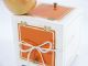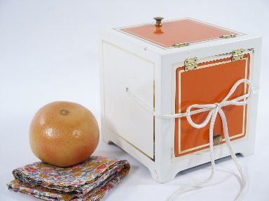 A lovely cabinet is shown empty by lifting open its door followed by returning the door to the closed position. A heavy cord is placed into the top of the box and threaded through holes in the sides of the box and the loose ends tied together in front. This may be left on the table or given to a spectator to hold. An orange is selected from several and it is then made to disappear! A finger ring that is borrowed from a spectator is also made to vanish.