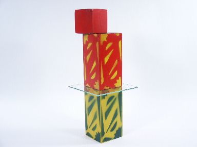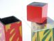 Two decorated wood chimneys each 6 1/2 inches high are shown empty along with a solid wood block of 2 3/4 inches and a piece of glass. The chimneys are stacked one atop the other with a sheet of glass in between.