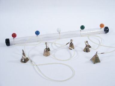 From a clear rod over 17 inches in length are seen to be 5 brass bells suspended from cords with each having a color indicator at the top of bar. Holding the bar the magician asks a spectator to choose any bell and concentrate upon it and this bell begins to swing gaining momentum swinging faster and faster! This should win an audience over to the fact that the performer must truly have some eerie power. Includes 3 pages of instructions. Condition very fine. | |
