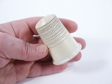 After performing a few moves with a thimble the magician as a finish to his routine causes the thimble to grow in size! Thimble is of lathe turned wood that has been hand stippled and finished in Pearl White. The beginning size is 1 1/2 inches high with a diameter of 1 1/16 inches at the rim and the finale size is 2 1/4 inches high with a 1 3/4 inch diameter at the rim. This special Thayer Wood Turning in very fine condition and includes instructions. | |
