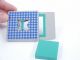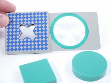 A solid screen having a square shaped hole and the magician drops a square block through the hole. The screen is placed into a case where the ends of screen are visible and the screen is removed from the case and the square hole has been replaced by a hole through which a circular block is dropped through! Very clever principle and includes instructions with illustrations for performance. One could patter around the square peg round hole if desired. Condition very fine. | |