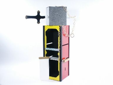 The cabinet measures 20 inches high x 7 1/2 inches x 7 1/2 inches and essentially the magician patters along the lines of the Sword and the Stone with the stone being a block on a long chain that escapes from the sword and penetrates 2 slide panels placed horizontally in the cabinet. Includes 1 page of instructions. Condition very fine. | |