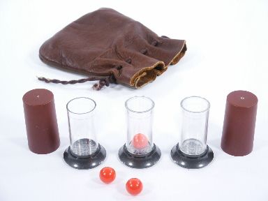 Three Crystal Vials are placed upon the table along with 2 covers for the vials and 3 balls. In an uncanny demonstration the magician causes the balls to jump from vial to vial also from his pockets to the vials! As Tenyo states "In one spooky sequence a ball penetrates through the bottom of a vial and this will fool even Professional Magicians!". Includes several pages of routining with 42 illustrations. Condition very fine. | |