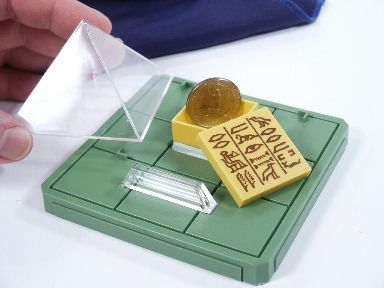 Covering the pyramid with a handkerchief the powers of darkness take hold and removing the handkerchief the coin is no longer visible in its holder.