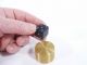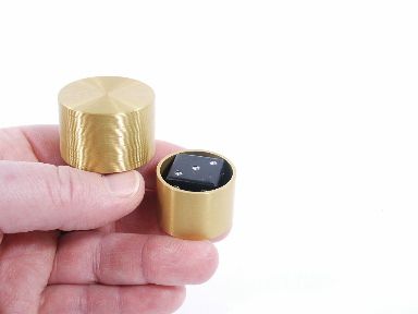 A gold anodized metal casket is opened to reveal a die also made of metal. A spectator is given the casket and die with the request that the die be placed within and the casket closed all being done with the performers back to the activity with everything out of view. The performer takes the casket in hand for just a moment and looks into the spectators eyes. The performer is able to divine the upper and lower most numbers on the die! This is a machined piece and includes instructions. Condition very fine. | |