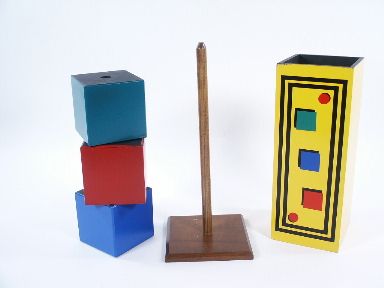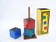Making use of 3 inch blocks in solid colors rather than ABC blocks this includes instructions for Haenchen's Traveling Blocks. The shell block has minor separation on two sides at the top where it joins to the horizontal surface otherwise condition very fine. | |