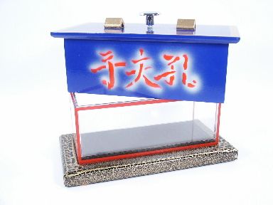 This handsome chest measures 11 1/2 inches wide x 6 inches deep x 5 inches high and will enable the performer to change silks (not included) into a dove or any solid load desired. The nice feature of this special chest is the fact that a load may be left behind or picked up by a simple turn of the knob. Includes instructions. Condition very fine. | |