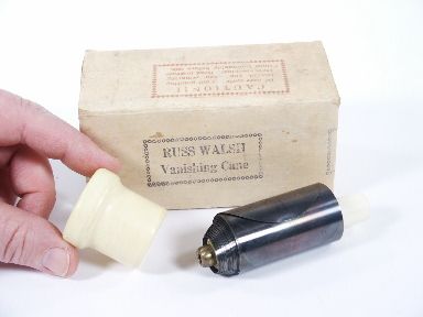 This was made as a cane with a larger diameter so larger silks or bouquets could easily be used as the cane vanishes or rather transforms into the aforementioned items. This is the cane with special cap in the original box and instructions. Condition very fine. | |