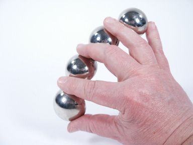 At first one chrome ball is shown about then magically a second appears to join the first at the finger tips then followed by a third and a fourth! This is performed with ease due to the construction of the metal balls. Balls are crafted in brass with chrome plating. The diameter size is 1 5/8 inch. In total the weight of all four is 1.7 ounces. Included photo illustrated instructions. Condition very fine. | |