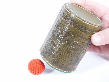 This cup will enable you to drop in the gimmicked ball and merely turn the cup over and have it roll out showing clearly to a spectator that everything is above board. This was an excellent idea by the late Bob Mason who had this custom made and he gimmicked each one individually by hand. The height is 4" and the inside mouth diameter 2 3/8". Includes illustrated instructions and the crochet knit balls. Handsome green leather with red crochet balls. Condition very fine. | |