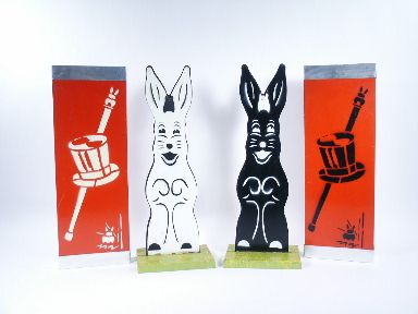 A larger size standing 19 1/4 inches high and set up for the basic effect of a transposition of a black rabbit and a white rabbit under covers. Shows some use but still has some mileage left in performances.