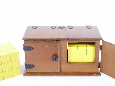 A clever and nicely made version of a sucker die box only with the use of a yellow block and with a surprise finish if desired of the block vanishing from the box and in its place will be found many sponge balls (not included). At finish two side panels are even removed showing the block has truly vanished! An extra block is supplied for reproduction if desired. Condition minor specks on one door otherwise very fine. | |
