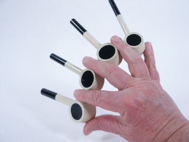 Crafted in metal and gaffed so that smoke may actually be involved in the production of one pipe after another in the fingertips. Includes photo illustrated instructions. Condition very fine.