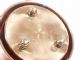 Of all the small pans this one is one of the most attractive in appearance with its beautiful copper and with brass finial along with the three brass feet. Stands 3 3/4 inches high and only has one slight dent near bottom edge of pan near one foot otherwise very good condition with only minor tarnish to cover. Bottom of pan has the Magic Wand Trademark Stamp. | |