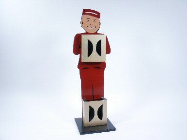 After 3 cards are freely selected from a deck they are returned to the deck and placed in a holder at the bottom of a bell boy. The magician takes one card at a time from the holder and shows the card to the bell boy and then drops it into the holder at the top. At any time a spectator may stop the magician when a card is held in front of the eyes of the bell boy and when the card is turned over it will be one of the selected cards! The cards are not forced and this one is easy to perform leaving the audience puzzled and in disbelief. Any deck may be used. Includes instruction. Condition very fine. | |