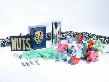 The boy with the box is laughing now at all of this and he is asked to open the box he has been holding and several more bingo devices go off followed by a cascade of spring paper flowers! Both boys are asked to pick up the flowers and now the audience roars as hanging on the back of one boys back is the silk and on the other boys back is a sign that says "Nuts".