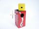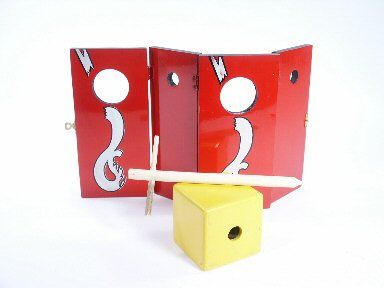 This is a twist on the Impaled Block Release in that this is a rectangular wood tube hinged to open flat. The block is imprisoned in the tube by a wooden stake through the sides of the tubes and the block is visible by way of holes in the sidewalls of the tube. At the will of the magician the block visibly penetrates the stake and falls from the tube. Includes instructions for this mechanical effect. Condition very good. | |
