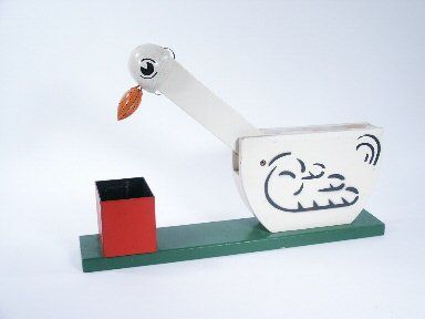 Here is the Granddaddy of all Card Picking Ducks and produced by Ireland's in Chicago. In the early catalogs you may find a picture of Frances and Laurie Ireland posed in front of a shelf of magic apparatus where one may get a glimpse of Otto in the days when one could be had new. The top covering plate on the body is absent but the duck dips its head and opens its bill to retrieve a card from the feed box. If you actually are going to use this it would need a new material fixed inside the duck's bill to give it more grip in order to pick up a card. Condition very good. | |