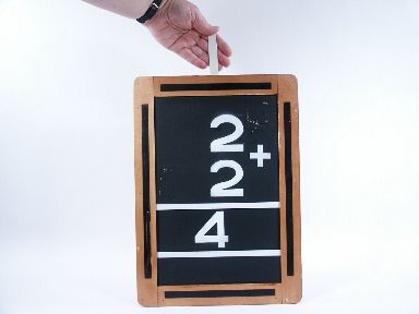 A slate measuring 16 3/8 inch high x 11 3/4 inches wide is shown showing addition with incorrect answer. Slate is turned around and the number one emerges from the top of the slate showing amount needed to correct the total. The mechanics from this slate allow for this number one to be pivoted down allowing for vanish at same time bringing the correct total into view for revelation once slate is turned around. Some use wear to black surface and light wear to wood frame otherwise operation is perfect. From Great Britain. Includes illustrated instructions. | |
