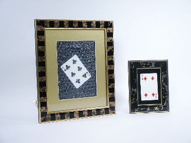 The small frame is 5 1/4 inch wide x 7 inches high and the large frame is 10 inches wide x 12 inches high and both used for the flash appearance of a selected playing card. Instructions included for the large frame and the small frame is similar by design. The four pages of instructions include illustrations. Designed and built by Colin Rose. Both are attractive frames and in very fine condition. | |