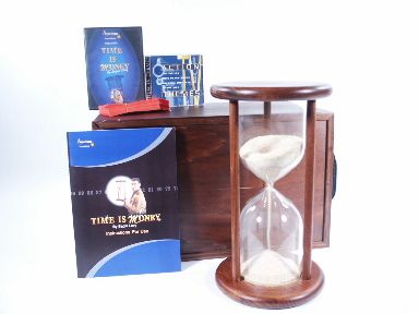 A super size hour glass is shown and the magician explains he will perform the most exact magic in the world. The hour glass is inverted and given to a volunteer and a bill is borrowed from a spectator. A piece of the bill is torn away having the serial number and this is given to the volunteer to hold. The magician causes the destruction of the bill and unable to restore it he points to the hour glass and discovers the sand is running out. With the statement of "Time is also worth money" the bill appears inside the hour glass and the bill is removed and the two pieces match!