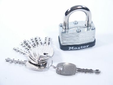 A gimmicked master padlock with 8 keys for the effect of having spectators try 7 of the keys finding they turn but don't open the lock and all the keys are placed in small envelopes. An eighth key is shown that does open the lock and it too is placed in a small envelope. The envelopes are mixed and one envelope that is chosen happens to be the working key! Includes instructions. Condition like new. | |