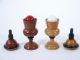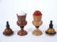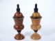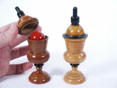 A petite set standing only 5 1/4 inches high turned of wood and trimmed in black. At first two balls one white and one red are handed for examination followed by placing one in each vase. Placing upon the lids a change is commanded by the magician and removing the lids the balls are shown to have made a transposition. These are of course mechanical vases and have light restoration to finish with the red and white balls and shells in fresh color. The balls are 1 1/8 inch in diameter. Truly a rare offering. Condition very fine. | |