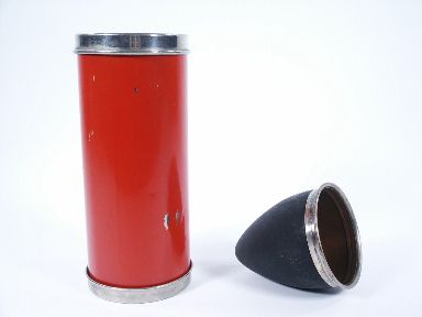 Measures 9 3/4 inches long with a 4 inch diameter giving the appearance of P&L. The bullet loader is made of copper and the retaining rings are nickeled. A small dent in the sidewall of tube otherwise fine. A strange thing about this curious piece is the retaining ring fitted to the copper bullet load is made of silver. If P&L is responsible for the manufacture of this piece they quickly changed their ways as this is a very heavy tube weighing 2 lbs 2 ounces. | |