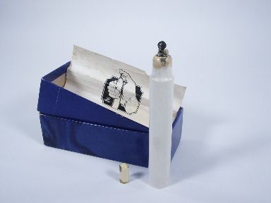 The wood candle with flint wheel and wick for reaching inside the coat and bringing out lit. Includes the cap to keep wick from drying out prior to production and all in a box along with illustrated instructions. This carries the large trademark stamp and is a seldom seen piece. Condition good. | |