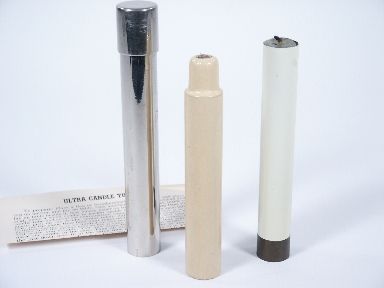 You may actually light the candle and then blow it out prior to placing it in the case for its ultimate vanish. Originally this came with an end cap to close off the shell candle but this cap is absent. Includes dummy wood candle that has yellowed from age. Includes instructions. Condition very fine. | |