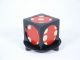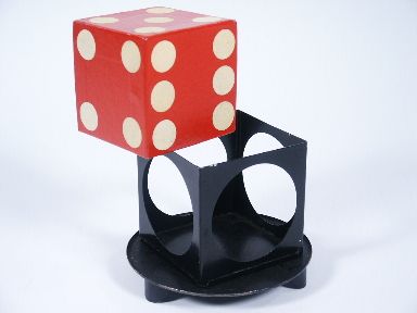 The die in the framework is placed atop a hat brim down and covered for a moment with a silk (not supplied). A last glimpse is given of the die in the frame and covered once more and when uncovered it is seen to have vanished from the frame! Lifting the hat the die is seen underneath having penetrated the hat! This carries the early large trademark stamp and the die in first rate condition with the metal frame and tray showing only moderate wear. Includes instructions. | |