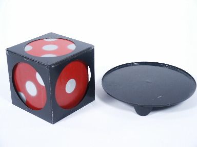 The die in the framework is placed atop a hat brim down and covered for a moment with a silk (not supplied). A last glimpse is given of the die in the frame and covered once more and when uncovered it is seen to have vanished from the frame! Lifting the hat the die is seen underneath having penetrated the hat! Die has silver spots and in first rate condition with metal frame and tray showing only light use with also the tray having the smaller trademark stamp. Includes instructions. | |