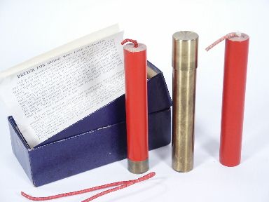 Firecracker is lit and placed into a case where it vanishes and is found hanging on the back of an assistant from the audience. This in a P&L blue box with faded writing that states large thumb tips. Includes the brass case tube along with shell firecracker and dummy wood firecracker. Includes instructions. Condition very fine. | |