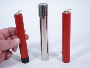 Firecracker is lit and placed into a case where it vanishes and is found hanging on the back of an assistant from the audience. Includes the shell firecracker and dummy wood firecracker and the nickeled case is trademarked stamped. Includes instructions. Condition very fine. | |
