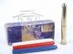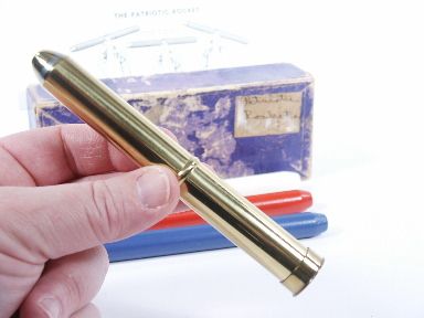 A red white or blue rocket is placed within the tube with the magician's back turned and the other two are hidden. Holding the tube for only a moment the magician is able to divine which rocket is within. What you don't often see is the box these came in and this is scarce in itself. The box is worn the rockets are in wonderful condition and the brass tube is in first rate Collectors condition with trademark stamp. Includes instructions. | |