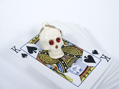Effect by Bill Nord where the finish is that of a chosen card among several placed in the jaws of the skull remains after striking the hand sharply for a unique revelation. Two routines are given in the three pages of instructions. Includes a new deck of old cards. Condition very fine. | |