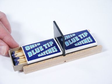 Upon a wooden platform two ordinary match boxes are placed with a solid piece of plex in-between. One match box has its drawer open and the other does not. Pushing the open drawer closed the other match box drawer opens! This may be repeated and at the end all examined! From the mid-60's. No magnets or threads here. Condition very fine. | |