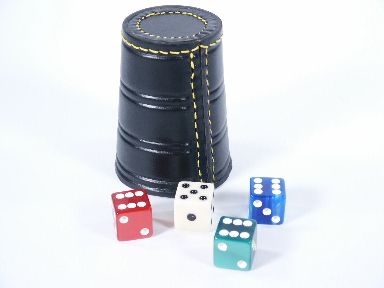 This handsome leather cup stands 3 5/8 inches high with a mouth diameter of 2 1/2 inches graduating with a taper to the bottom of the cup that is 2 3/16 inch diameter also having a built in metal shim to attract a magnet. The dice are approximately 3/4 inch and the white die has a magnet which attracts to the bottom of the leather cup. No instructions. Condition very fine. | |