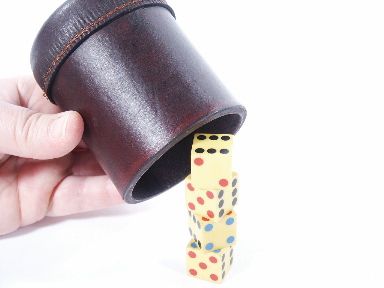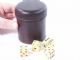 It is not easy to find the right style of dice cup for stacking routines as today the cups are made with a turn out lip inside to keep things fair. The four dice are of an early style with pips in red blue and black. Condition very fine.