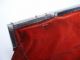 A red velvet bag with a beautiful nickled frame closure with chain handle with switching element activated by a tiny knob. The nickled frame has a sleeve over clasp which prevents the bag from opening prematurely. Bag has a 1/2 inch wear line in velvet showing material underneath but this is a small area up by the frame. Condition is remarkably good for this early Thayer piece. | |