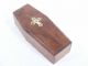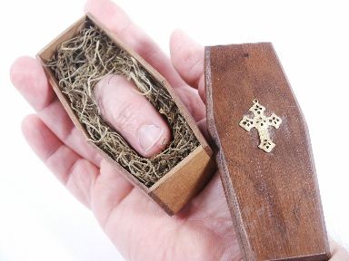 In idle moments Mr. Miller thought it would be nice to take the old Finger in the Box joke a step further by making a nicely finished coffin of walnut wood along the style which Dracula would approve. Having an opening on the underside that will enable for the practical joker to insert the forefinger or second finger of hand holding the closed coffin you can imagine the gags to be thought up once you release the youngster within.