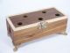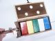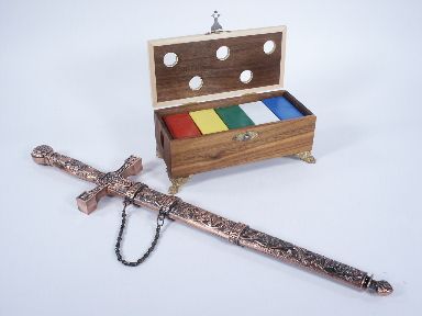 Mr. Miller has been out or production for over a year and it is unlikely that items will be made again. Don't miss this opportunity to acquire some of his handmade items. Showing this regal looking chest with its claw feet to the audience the magician opens the lid and allows the 5 different colored blocks within to tumble out. Randomly choosing a spectator the magician asks for their choice of 2 colors and they are named. The magician places the blocks back in the box and closes the lid latching it securely. A rare and beautiful sword imported from the orient (China) is shown and thrust through sides of the cabinet for which there is an opening provided thus impaling all blocks. The magician asks the spectator to once again name aloud the two selected colors which is done and the magician releases the latch. Picking up the chest by the sword the magician slowly twist the handle of the sword tipping the chest over naming a color of the two selected and that color block falls away from the chest into the magicians awaiting hand! This action is followed by the naming of the last color and this block too follows by tumbling out of the chest and into the magicians hand both having penetrated their impalement by the sword! The chest measures 7 inches wide x 3 1/2 inches deep at the base of the claw feet and stands 2 7/8 inches high the sword in its own sheath is 16 3/4 inches in length and all of metal. Includes instructions. A signed piece. First rate Collector's condition. | |