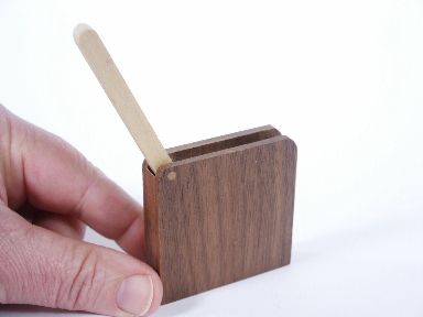 When you think of rattle box you think of a small rectangular box as most of us have known made by various manufacturers. This one devised by Clarence Miller is rather simple looking measuring 2 1/8 inches square and only 1/2 inch thick made of walnut with a simple basswood closing arm that reminds one of a traffic gate.